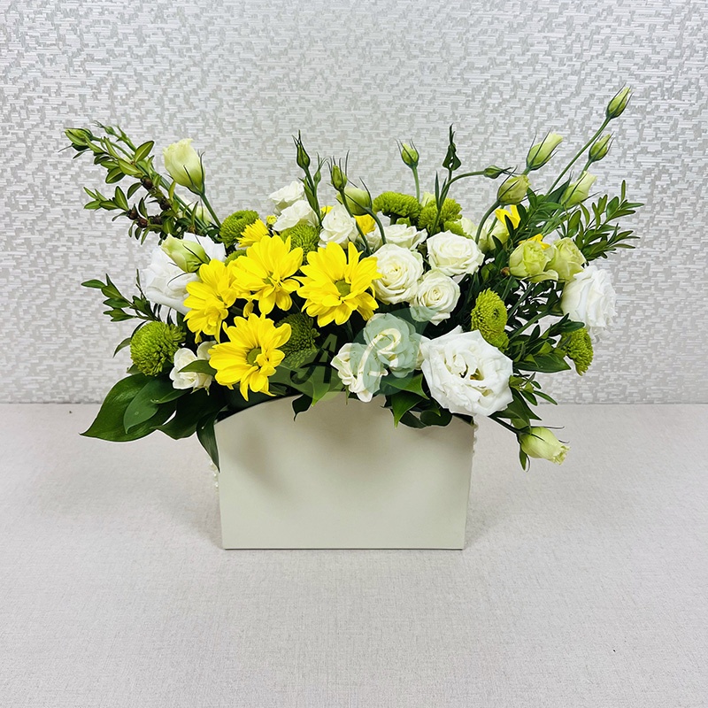 Хризантемы и эустома славятся своей стойкостью, поэтому этот букет будет радовать не один день и не огорчит осыпавшимися лепестками на следующее утро после доставки.