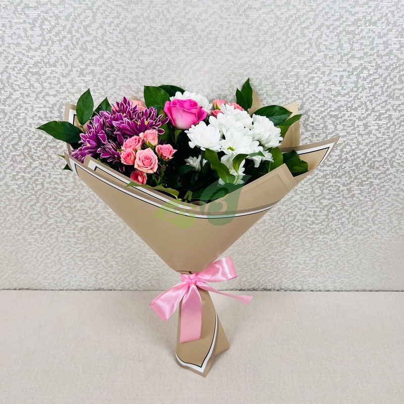 Сборный букет из кустовых роз и хризантем – это недорого и красиво. Такие цветы можно покупать для разных праздников и вовсе без повода.