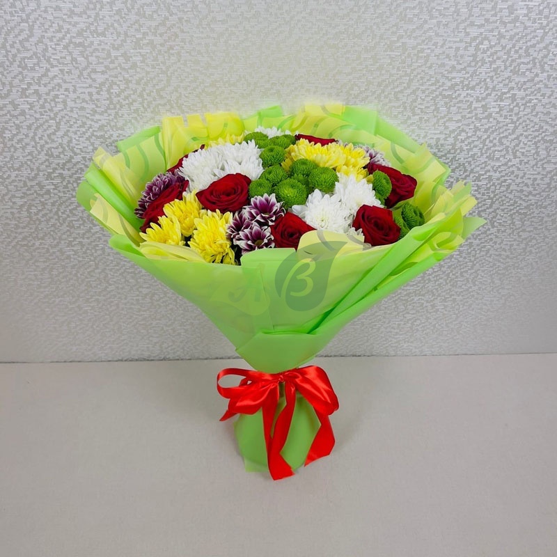 - Хризантема кустовая - 12 штук, цвет - микс, длина стебля - 60 см;